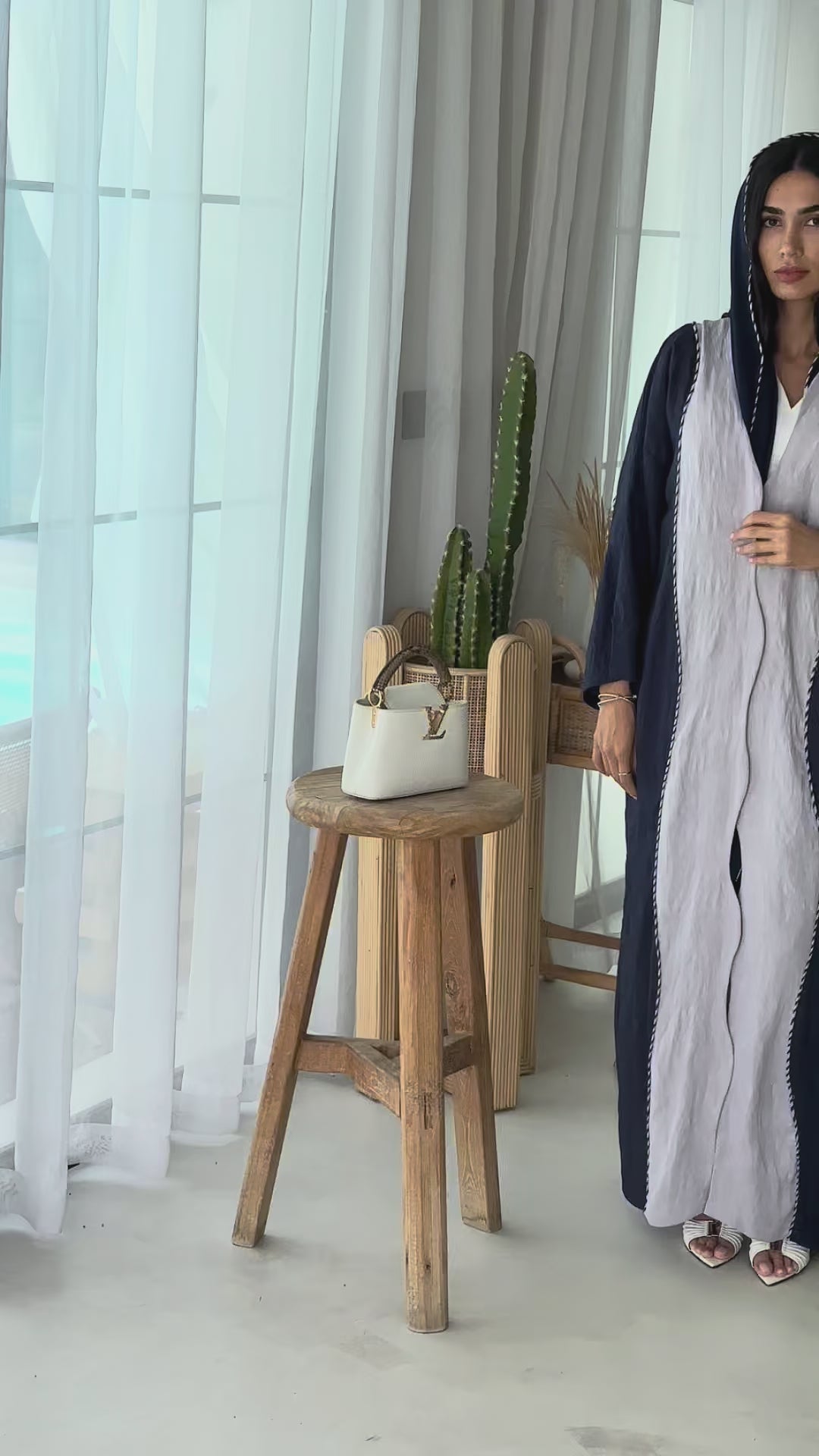 Ethereal and graceful, the Moonlight Abaya captures the quiet beauty of moonlit evenings. Designed in a deep navy tone with flowing panels of soft dove-grey, this piece reflects a delicate balance of contrast and calm. The wavy front detailing and stitched accents add fluidity and depth, while the lightweight texture ensures effortless movement.